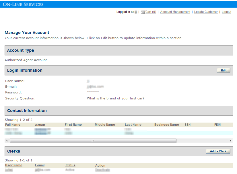 After an authorized agent selects the link in the User name column in the Clerks section of the Account management page, this page displays and allows authorized agents to edit an existing clerk account.