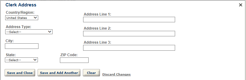The Clerk address info screen displays when authorized agents select Add additional contact address, or when they edit a contact address.