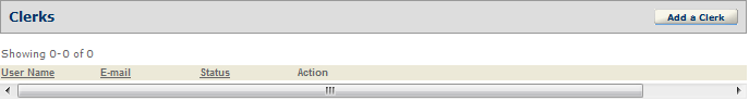 The Clerks section displays for the account management page of authorized agents only. This section provides the Add a clerk button for adding clerk accounts, and the Action column, with the Activate or Deactivate link, for the agent to activate or deactivate a clerk account.
