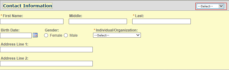 When you configure the New clerk info page, remember to select the target contact type first if you want to customize the field settings. The customized settings only apply to the selected contact type. If you define the field settings without selecting any contact type, the Contact info screen displays the default field settings.