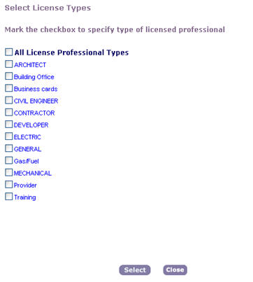 If you want to specify the licensed professional types allowed to upload, delete, or view the document type in ACA, select the Licensed professional button and indicate the specific licensed professional types in the pop-up window. Then choose Select.