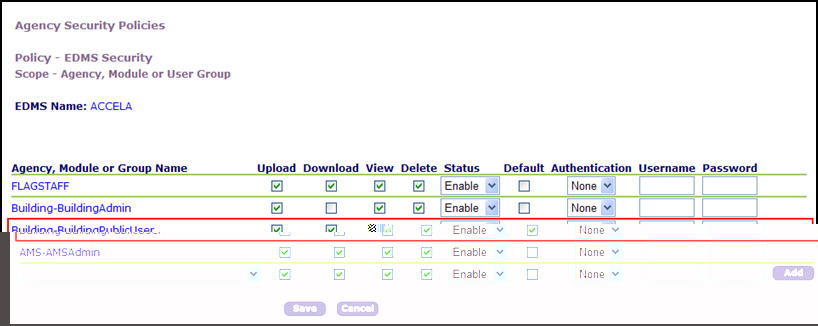 Civic Platform provides three ways for administrators to set permissions for public users to upload, download, view or delete documents attached with a record, either it be a record attachment which is directly uploaded for the record, or a people attachment which public users upload to the licensed professional account relating to the record. Administrators must define the security policy permissions for EDMS (Electronic Document Management System). Then, permissions can be assigned to document types, which refine or restrict the EDMS permission settings to ACA users. Agency employees may also define permissions for a particular document on an application though document configurations attached to the record. The individual document permission setting performed on the record overrides the document type level permission setting.