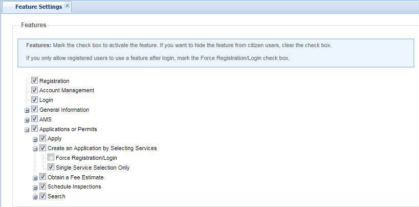 After marking the Create an application by selecting services check box in Feature settings for the main agency in a multiple-agency environment, use the Single service selection only check box to further control whether public users can select a single service or multiple services in the main agency.