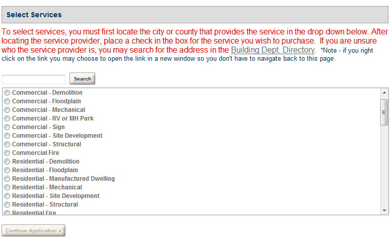 If the Single service selection only check box is marked in Feature settings, the Select services page displays a list of services for public users to make a single selection only.