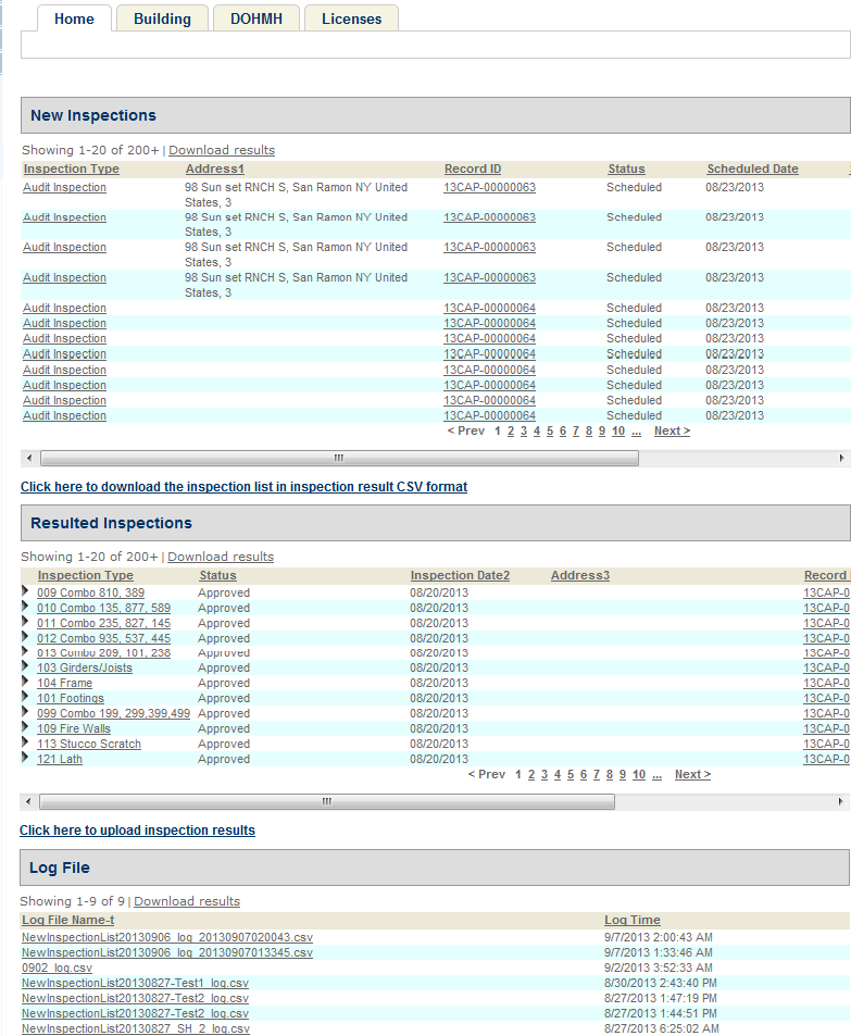 Contract inspectors or self-certified inspectors are not agency employees but they can log in to Citizen Access to do the following through the Upload inspection results page: