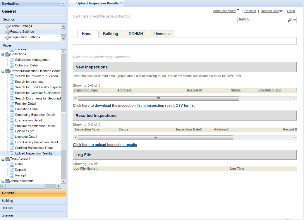 Customize the Upload inspection results general web page located in the Provider/Education/Licensee search folder.