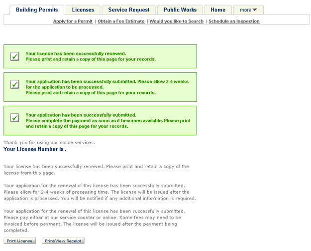 You must customize the Renewal receipt page with the content you want to display to public users. This page displays after paying for fees relating to the renewal. You can also use Report Manager to create a receipt report and assign it to the Print button on the page. For instructions, see Associate reports with print/view buttons. Refer to Web pages for instructions on how to customize text and define the font, font color, and font size.