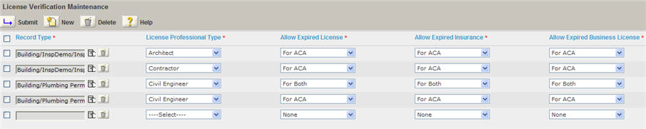 You can configure Civic Platform to verify the status of a license type against a record type so that administrators can control both restrictions and permissions to information or to an application. This is particularly useful when a licensed professional has a license, business license, or insurance coverage that is expired. For example, in the State of New York, all general improvement contractors and home improvement contractors require a home improvement professional license (HIC) and proper insurance coverage at all times. Insurance includes Liability, Worker’s Compensation, and Disability. Agencies in the State of New York must define a relationship between the building permits and the insurance type status and license type status so that only contractors with a current license and proper insurance coverage have access to building permits.