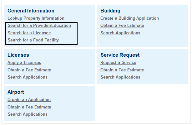 Locate the Search for a licensee, Search for a Provider/Education, and Search for a food facility items.