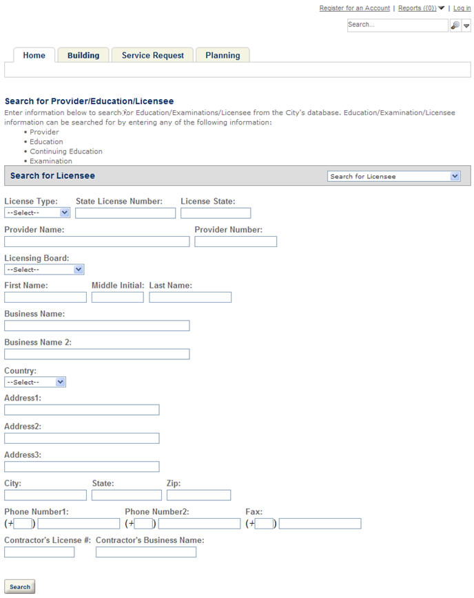 Your agency has the option to limit the licensed professional search results to display only those licenses associated with the current user. This is particularly useful when a public user logs in to Citizen Access and wants to create a record for which the agency requires an associated license for processing. When they search and select a license, Citizen Access only returns those licenses associated with their own account. For example, a contractor logs in to create an electrical permit, which requires a license for processing. The contractor selects the Search button to search and select one of his licenses to associate with the record. After entering search criteria, Citizen Access only returns those licenses matching the search criteria and associated with the contractor.