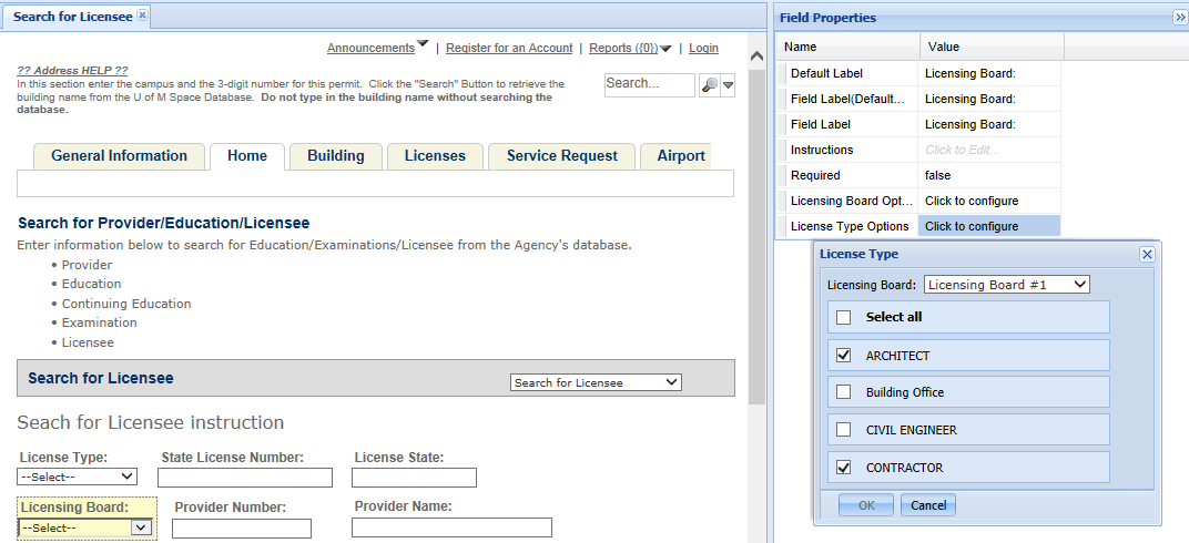 When customizing the Search for licensee form, you can select the Licensing board field and then configure the license type options for the licensing boards.