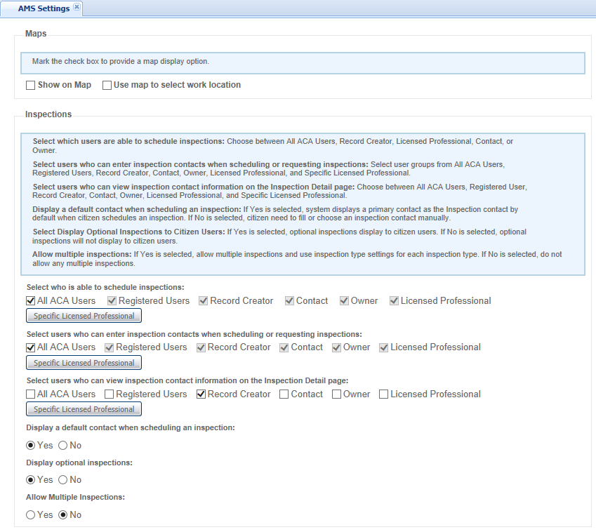 The Module settings configuration page is one of the most critical elements to setting up your Citizen Access website. The page comprises multiple sections which contain configurations specifically relevant to the module. Sections include: maps, inspections, workflow, online payment accessibility, record copy functionality, contact display controls, search functionality, filter functionality, report display controls, license verification page configuration, and record detail section configuration.