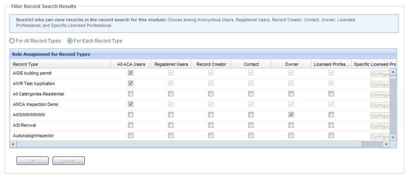 You can define who can search and view the records of the specified record types based on their user role in Citizen Access. This feature filters search results so that Citizen Access only returns records of record type applicable to a public user’s role in their search results list. For example, a licensed plumber can perform a search and see only plumbing permits. This filters the result list so the plumber does not have to see electrical permits on the results page.