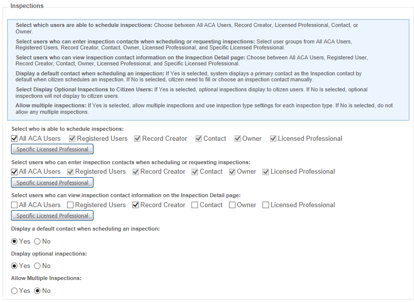 Define who has permissions to input or change the inspection contact information when they are scheduling or requesting an inspection. Select check boxes next to the users allowed to do so. Options include: All ACA users, Registered users, Record creator, Contact, Owner, Licensed professional, and Specific licensed professional.