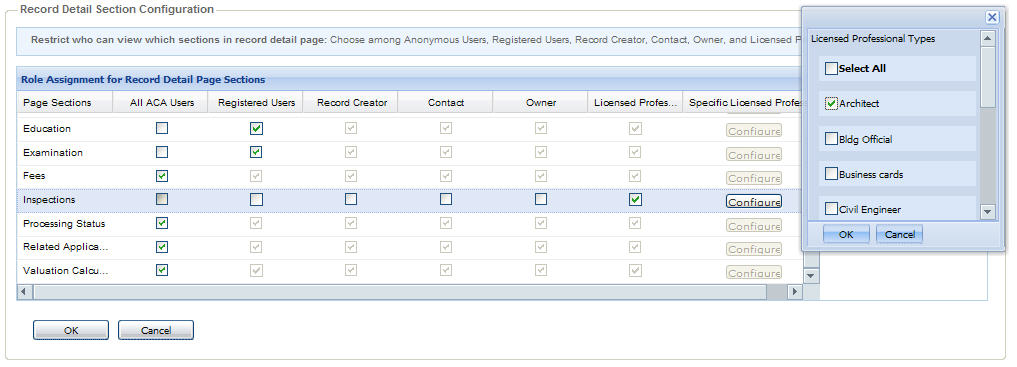 Scroll through the list of all page sections on the Record detail page and set the permissions. If you want to set configurations for a specific type of licensed professional, you must select the Licensed professional option and select the Configure button in the Specific licensed professional column. This opens a Licensed professional type window where you can define permissions and restrictions accordingly.