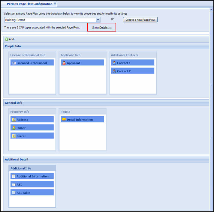 A page flow allows the agency to define the user experience when completing an application in Citizen Access. You define page order and what information or scripts relating to each page. For example, when a user applies for a building permit online, the administrator configures which page displays first, second, third, and so forth until all information about the application is collected and the associated fee is paid. The applicant may provide license information during the application process. You can associate a script to that page during the application process to verify license validity and expiration.