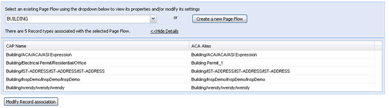 Select the Modify record association button to add or remove record types associated with the page flow or click the Hide details hyperlink to return to the page flow customization screens.