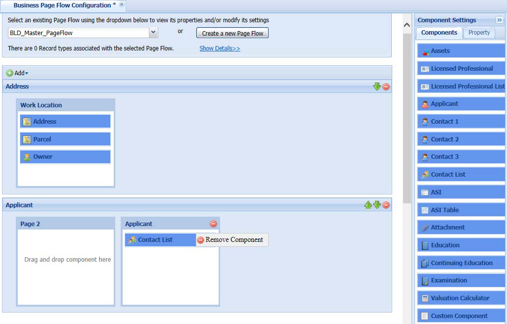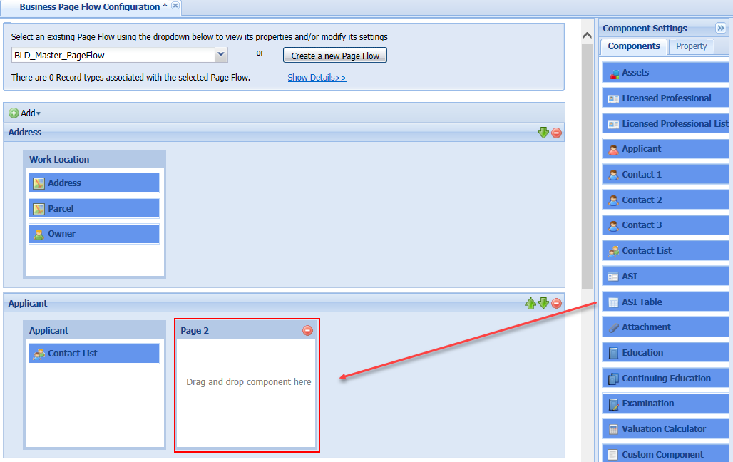 A component is a SmartChoice component, which relates to a section of an application intake form in Citizen Access. A list of components display on the right panel where they can be selectable for a dynamic page when a page flow is selected or a new page flow is created. You can drag and drop the desired component to the page and do some settings for it in the Properties panel. See Move or delete a component for a complete listing of components and Move or delete a component for a full listing of setting items.
