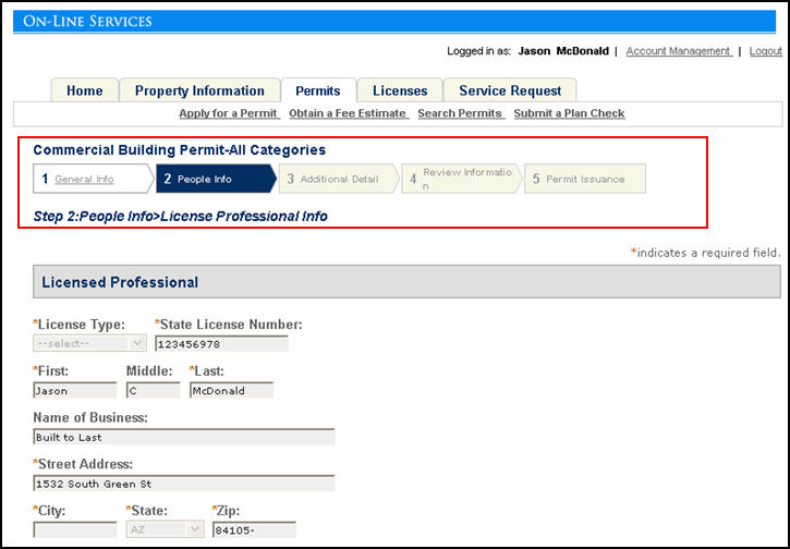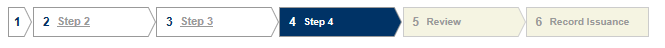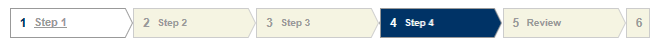 At the top of each web page, a user views a breadcrumb navigation bar with the name and number of each step. This breadcrumb is used to identify where a user is at in the page flow process. The current step a user is working on stands out in the toolbar. An active or completed step displays a bold step number. An inactive step displays the step number in gray. At any time, a user can return to a previous, or active step by clicking the step name or number in the toolbar and the associated page(s) come into view. A user cannot jump forward or skip steps.