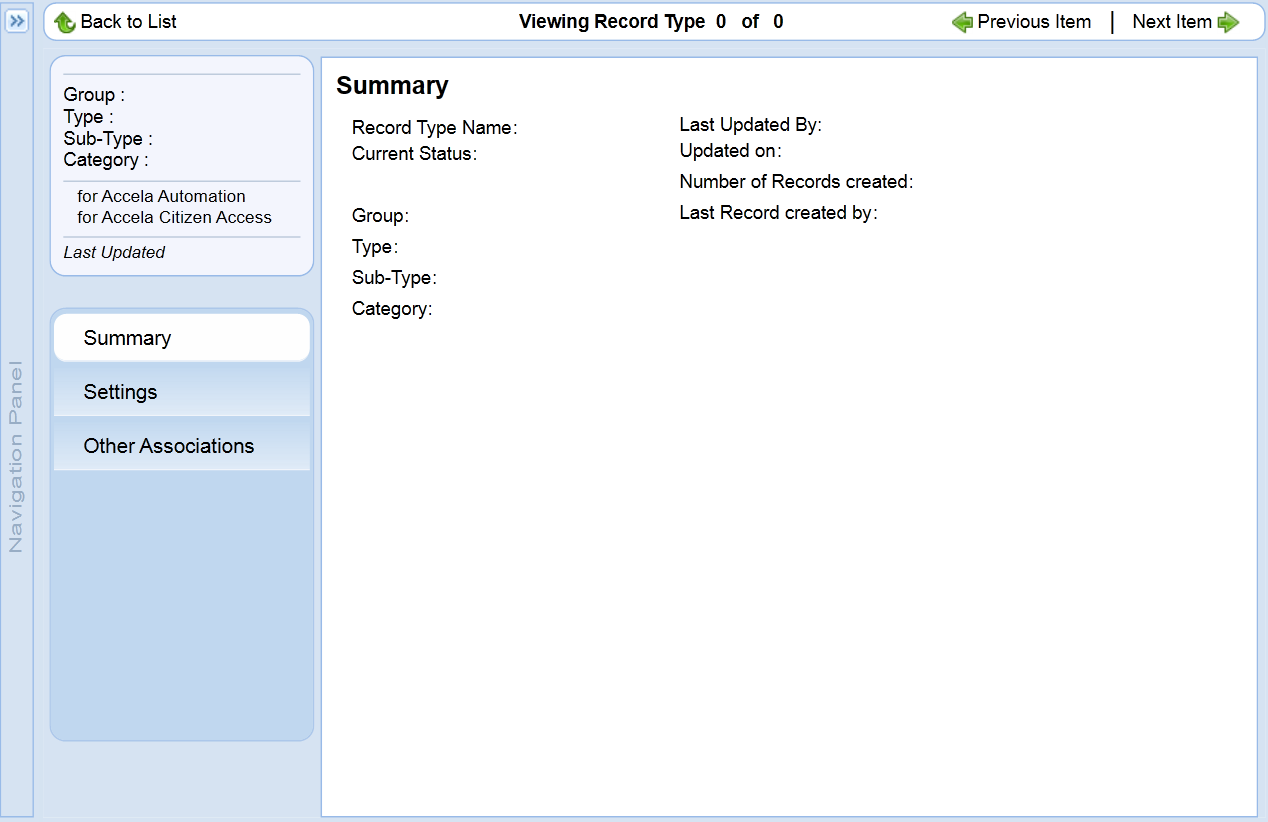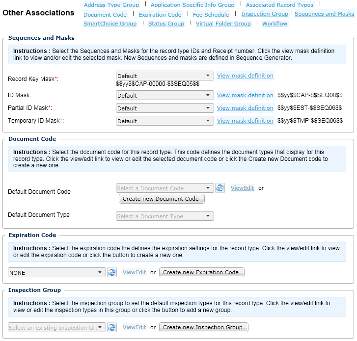 After defining the basic configuration and the settings for a record type, you can complete the other associations of the record type. These configurations include: Address Type Group, Application Specific Info Group, Associated Record Types, Document Code, Expiration Code, Fee Schedule, Inspection Group, Sequences and Masks, SmartChoice Groups, Status Group, and Workflow. Agency administrators may have defined some of these configurations in the basic record type setup, but you can modify the configuration if you have permissions to do so. Also, you can use this record type other associations portlet to create new codes or groups and assign them to the record type if you have permissions to do so. For an overview of the format for the Other Associations page, see the “Record Types” chapter in the Accela Civic Platform Administrator Guide.