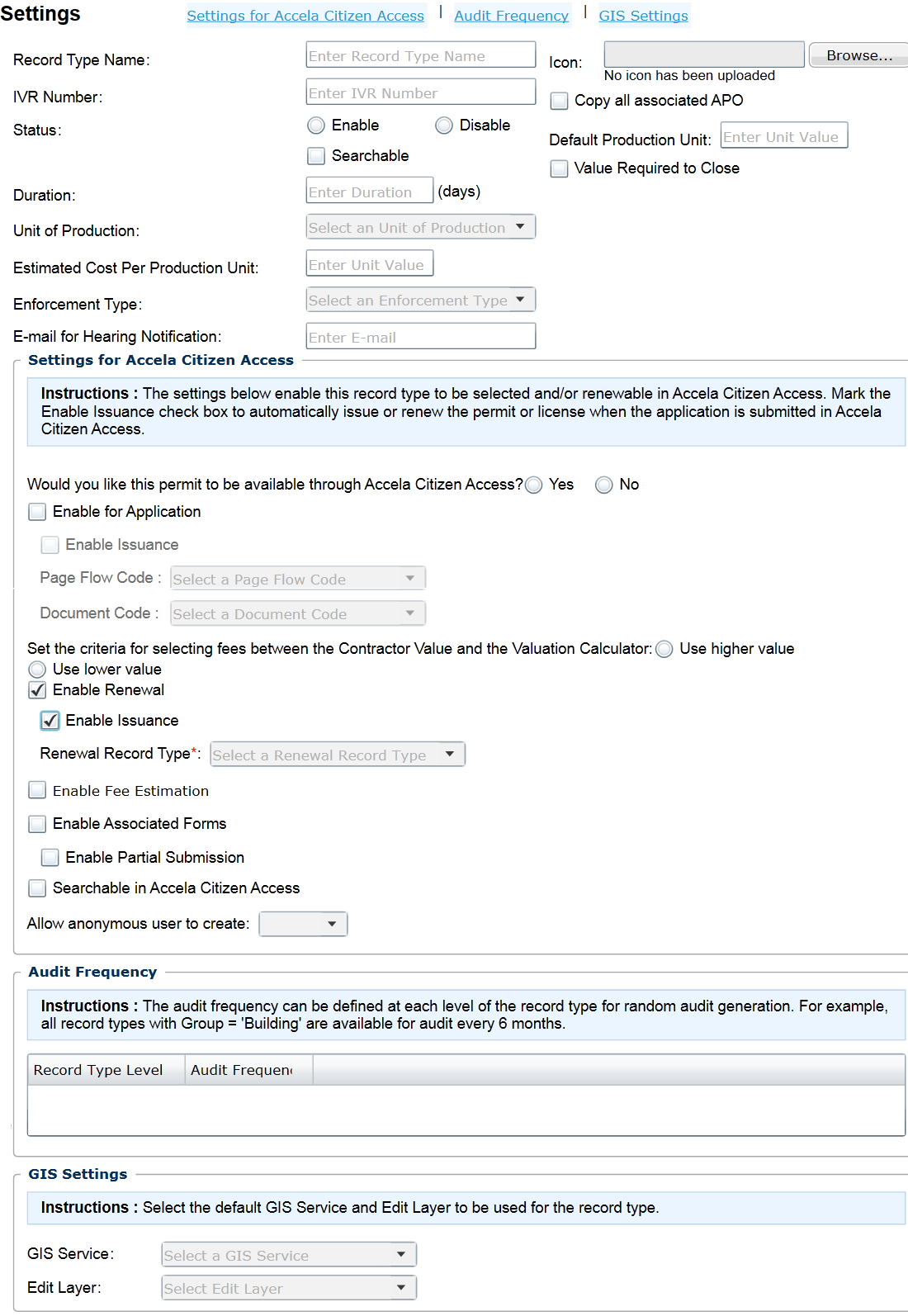 After defining the basic configuration for a record type, you can complete the record type settings. These configurations include settings for Citizen Access, Audit Frequency, and Accela GIS Settings. For an brief overview of the Record Type Settings page, see “Configuring Record Type Settings” in the Accela Civic Platform Administrator Guide.