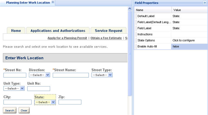 This feature allows administrators to enable or disable the auto-fill function for the City and State fields. For example, when the city or state auto-fill is disabled, Citizen Access displays blank information in the fields so public users can enter their own city and state information. When the city and state auto-fill feature is enabled, information extracted from the agency profile automatically populates the city and state information. Administrators can enable auto-fill of the State field and disable the city information about public user data entry. The auto-fill feature is disabled by default for both fields.