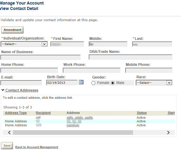 The Amendment button is associated with a record type filter and becomes available to public users on the Contact information page. They can select the Amendment button to submit an application that the record type filters to update the read-only information of the selected contact. The selected contact information auto-populates in the first contact section of the Amendment intake form.