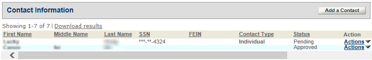 The Contact information section in account management displays the list of contacts that public users already associated with their account. Public users can select Add a contact to add more contacts, or select the View action link on a contact to view the contact details. The windows that display then guide public users through the process.