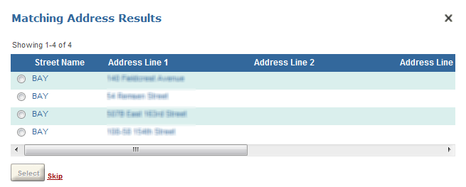 Public users can either select a matching address, or select the Skip link to create a new address instead.