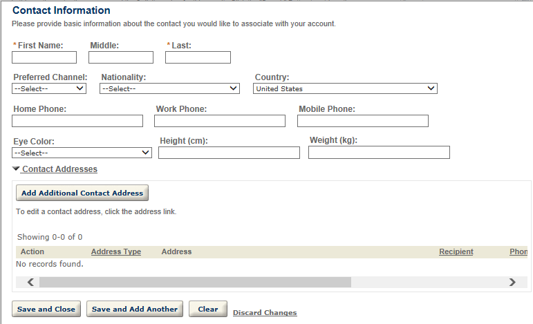 When public users select the Save and close button, Citizen Access returns to the Account management page. When public users select the Save and add another button, Citizen Access stays at the New contact window. If there are close matching reference contacts for the entered contact, Citizen Access directly replaces the entered contact with the first reference contact that meets the close matching criteria of the highest priority.