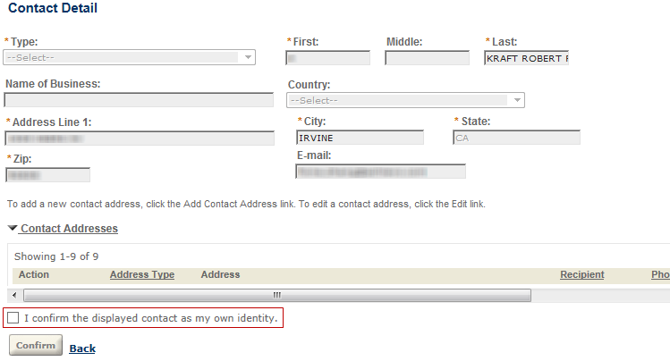If the follow-up page prompts users to select “I confirm the displayed contact as my own identity,” a reference contact in Civic Platform is a close match to the contact information entered. The displayed are the details of the reference contact. At confirmation, the public user account is associated with the reference contact.