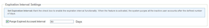 The image below shows the expiration interval settings shows the Expiration interval settings section of the Registration settings page. This section relates to the number of days Civic Platform saves inactive registrant information before purging from the system. If the Account verification setting is enabled, a registration account remains inactive until the registrant activates their account by selecting the hyperlink associated with their account verification email they received after registration. Refer to Notification emails. The expiration interval setting defines how many days allocated to the registrant to select their hyperlink before their registrant information expires and is purged.