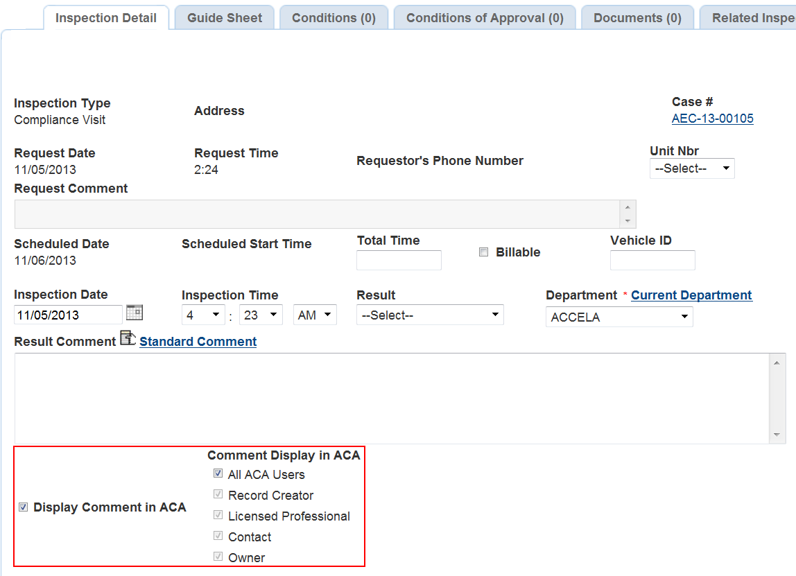 Note: The standard choice DISPLAY_INSPECTION_COMMENT_IN_ACA controls the display of all inspection comments and overrides the settings in Comment display in ACA and Display comment in ACA in every inspection. If you do not configure the standard choice, comments display so all ACA registered or anonymous users can read them by default.