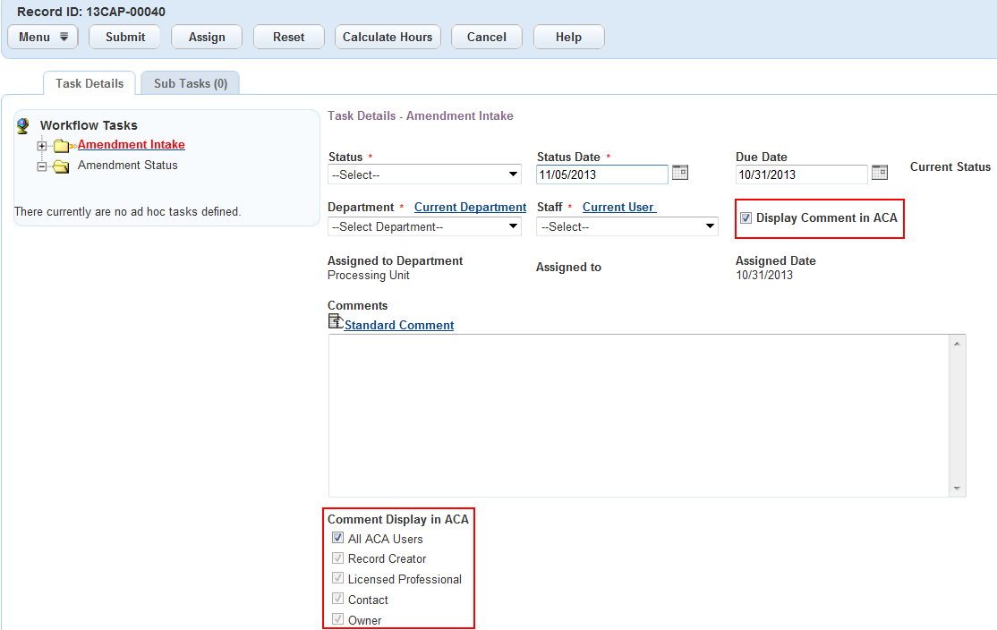To hide all comments from all ACA users, clear this check box, and the Comment display in ACA field is inactive.