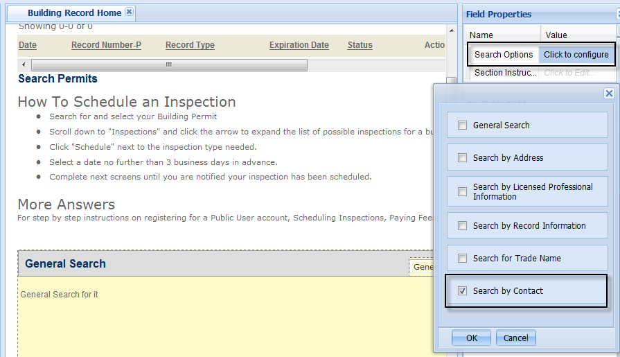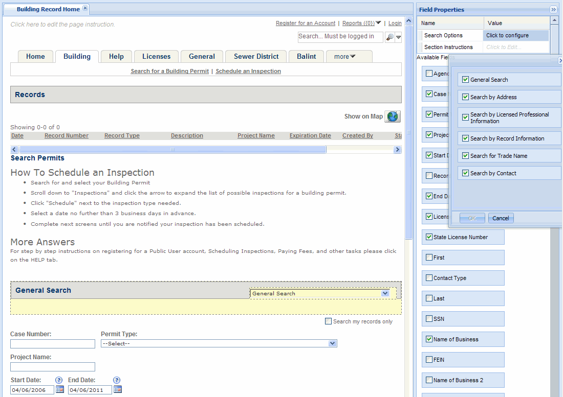 From the APO search page, you can determine which fields can display to the search form as the search filters. You can decide what type of information public users can search for, Address, Parcel, or Owner information. For example, you can allow public users to search for address and parcel information, but no owner information. You can also configure the fields in the APO details pages to define which information Citizen Access returns after public users perform a search using Address, Parcel, or Owner information.