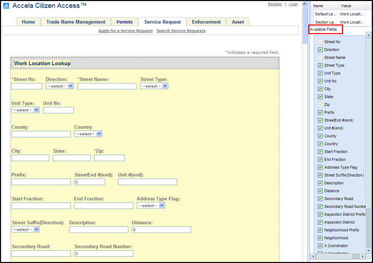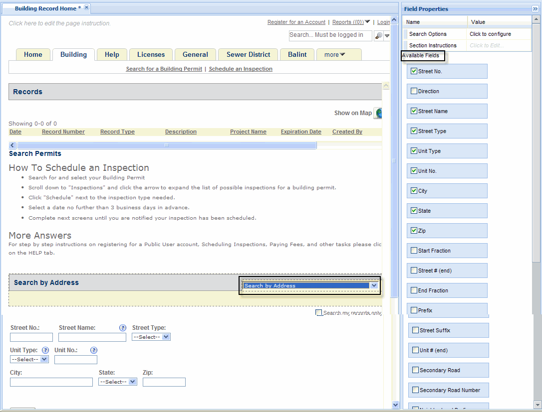 You can define which Address fields you want to display in the Address search and Address detail areas in Citizen Access. Citizen Access lists all address fields defined in the Civic Platform database as options for you to use. Enable or disable address fields for the Address search and Address detail areas for a module on the Record home page and the Module information page in Citizen Access setup.