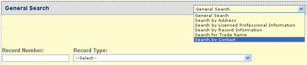 Your agency can provide public users with the ability to search for records by contacts. Public users enter contact name search criteria. After choosing a contact name from the results list, Citizen Access displays the records associated with the contact name.