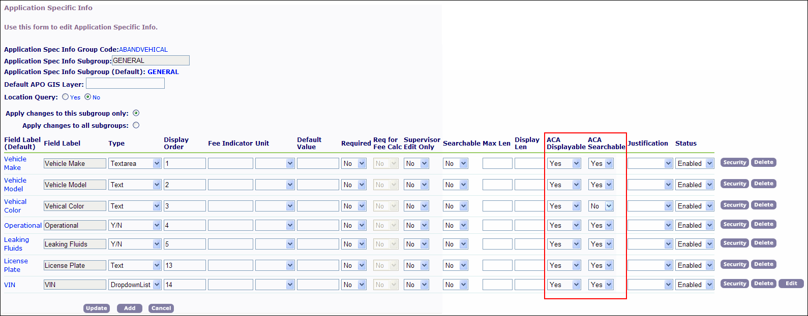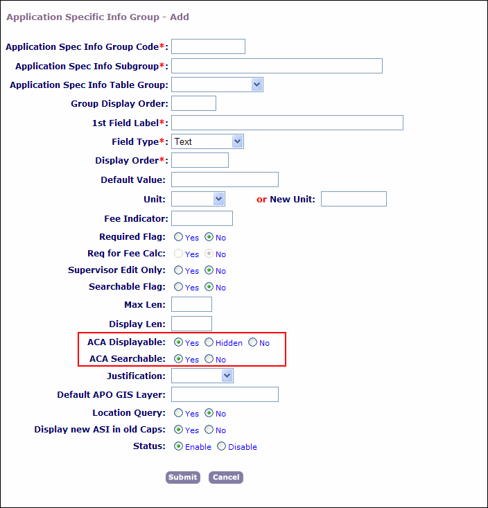 If you select No for both ACA displayable and ACA searchable, the ASI field does not display in the search form. It is recommended that you not use this case. If you do not want the field to display in the search form, mark both radio buttons as No.