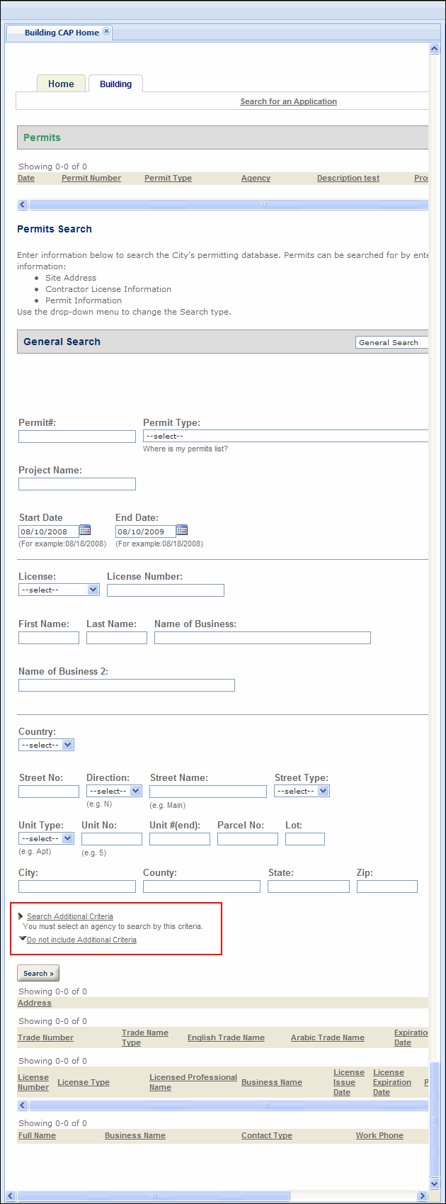 For example, you want the builder to be able to search for a town home building permit based on the number of bedrooms and bathrooms planned for the project. When the builder navigates to the Building Permits Search page, scrolls to the General Search section, and clicks the Search Additional Criteria button, a # of Bedrooms field, a # of Bathrooms field, and other associated application-specific information fields display. The builder enters a value in the relevant fields and clicks the Search button. Citizen Access runs the search and lists all of the records that match the builder’s criteria.