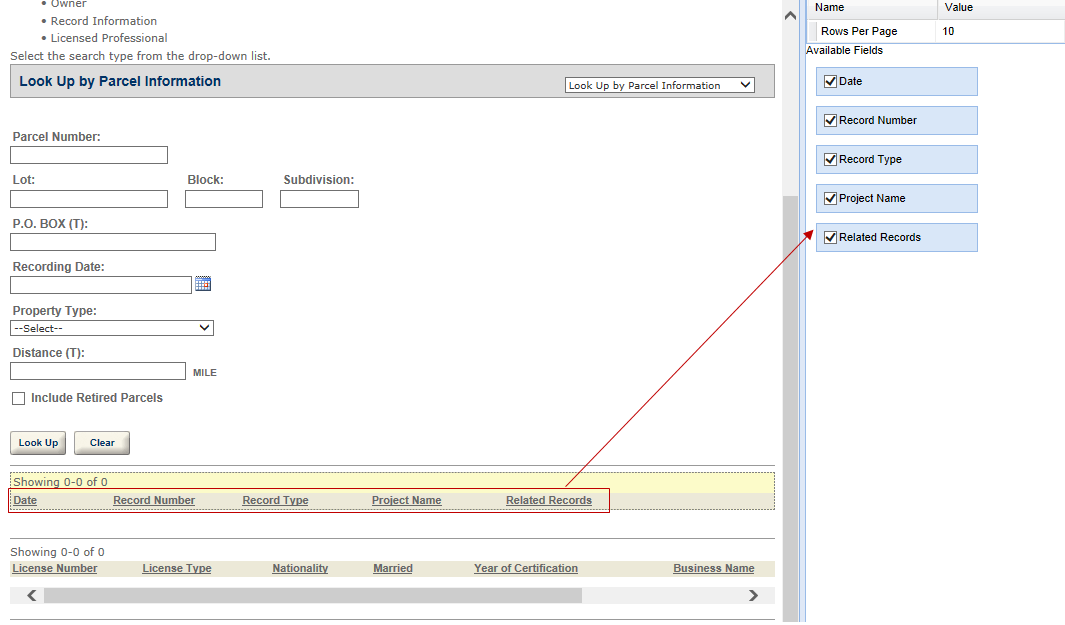 You can configure Civic Platform and Citizen Access setup to create customized search forms for records and APO (Address, Parcel, and Owner) using APO template fields. For example, you can display the parcel template field Property type in the Look up by parcel information form and then public users can use that field to locate any parcels of a specific property type.