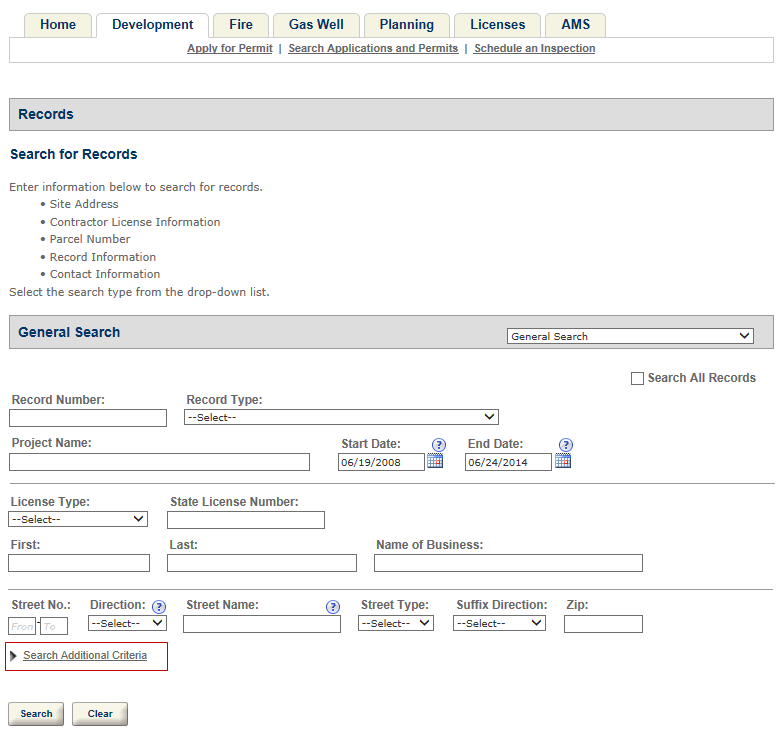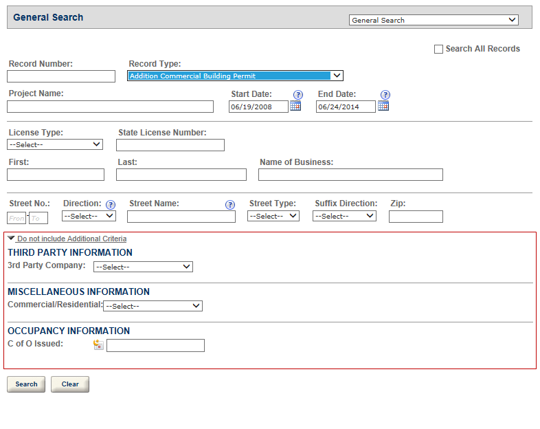 You can enable public users to search for records by associated application-specific information (ASI). When you configure the ASI fields, a Search Additional Criteria option displays in the search form which you can click to expand to view and search by the ASI fields associated with the record type. Each ASI field group displays on the search form under the ASI subgroup name.