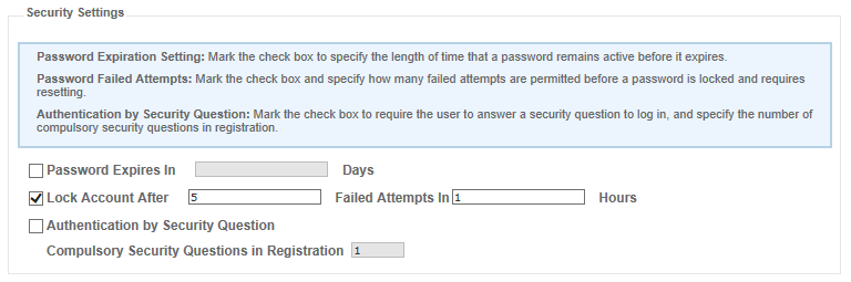The Password settings section of the Register license page is used to configure password expiration settings and password failed attempts. These items relate to the password security definition in the registration definition section. The password expiration setting field sets the number of days in which a user’s password expires, and the password failed attempts fields set the number of times a user can enter an incorrect password during a specified period before their account is locked.