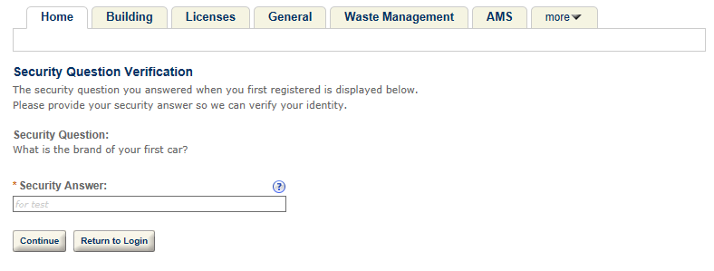 If you enable the Authentication by security question option, when a public user logs in to Citizen Access, the user must answer a security question.