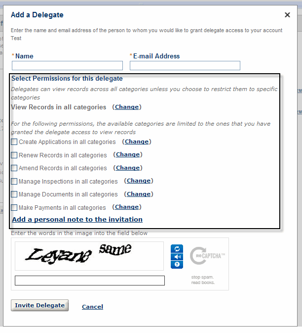 You can configure Citizen Access to provide public users with the ability to designate other public users as their delegates and grant the delegates permissions to access their data. Delegates can work on the data based on the granted permissions, such as viewing records, scheduling inspections, creating, renewing and amending records, uploading, downloading and deleting documents, and making payment.