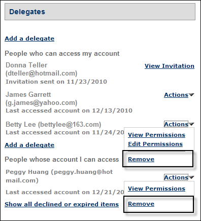 Public users can terminate the delegate relationship by removing them from their Delegates section at any time. In this way, the granted permissions are revoked from the delegates, thus the removed delegates can no longer view or work on the data of the public users they act on behalf of.