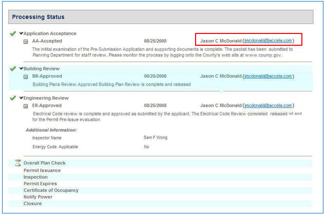 The email address field on the user profile for the assigned person populates the contact email address displaying to public users on the workflow. For example, if Stan from the agency changed the status of the workflow, the email address defined in his user profile displays in the processing status section of the record details page in Citizen Access. Those public users associated with the record can click the email address hyperlink and make email communications with the agency about new developments for the record. For information on how to access the user profile to set an email address, refer to the “User Profile” section in the Accela Civic Platform Administrator Guide.