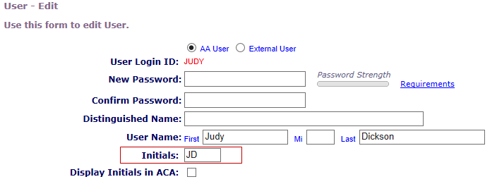 - Locate the Initials field and enter the user initials you want to display for the user.