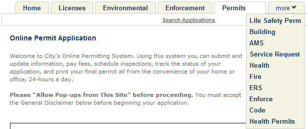 When an agency enables numerous modules for the site to a point where the real estate on the web page cannot accommodate all the tabs across the top of the page, Citizen Access displays one more tab on the far right side of the tab bar. When a public user clicks the more tab, any additional modules that do not fit across the page display in a drop-down list. You can customize the order of module tabs on the top of web page. See Change tab display order. If you select a module from the module drop-down menu, the organization of the tabs shift to make room for the new module tab in view. Since, Citizen Access does not manipulate the size of the tabs, various modular tabs may be moved to the more drop-down list.
