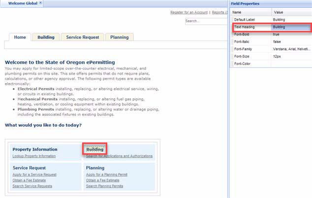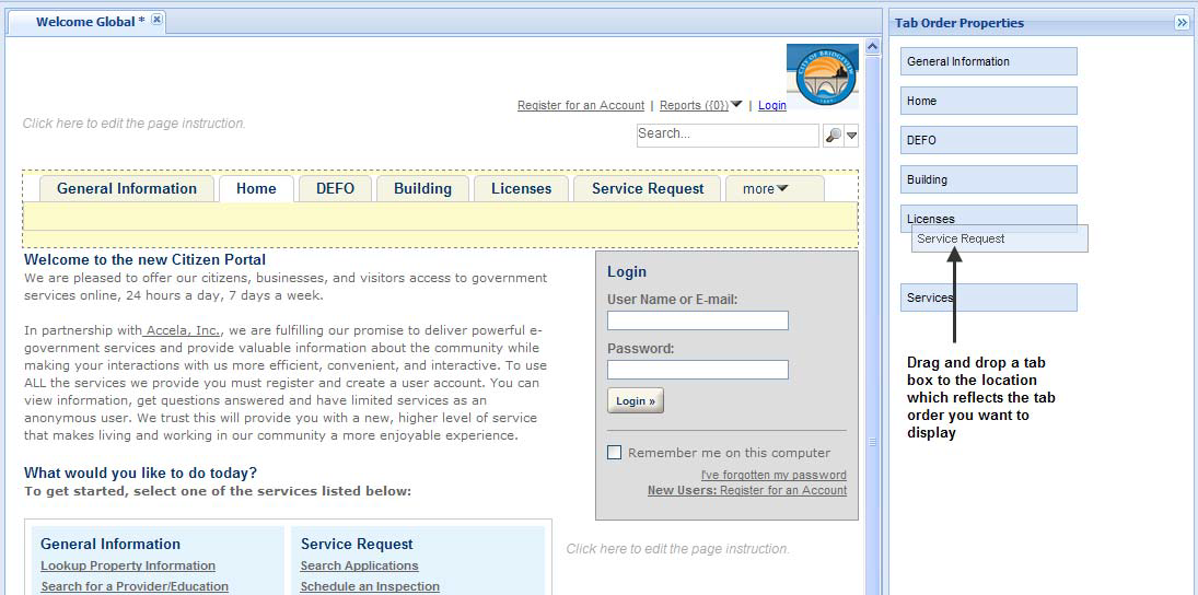 You can change the module tab text, tab display order, and view the More tab to accommodate additional modules in a list at the top of Citizen Access web pages. If you want to add a module tab, you must enable the module in Citizen Access on the Feature settings page.