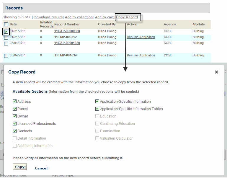 Public users can clone an existing (parent) record to create a new record of the same record type on pages, such as the Record detail page, the Receipt page, the record list, and the record search list. When public users clone a record, they specify the source record content they want to use to populate the new record. The selected source content is populated in the corresponding sections of the application intake form. After selecting the desired source content, public users must go through the record creation process to modify the populated information as needed, fill any blank fields, and complete the new record creation.